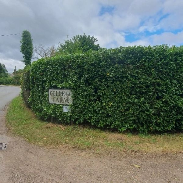 Neatly trimmed Lorrel hedge outside a yard where we provide routine grounds maintenance.